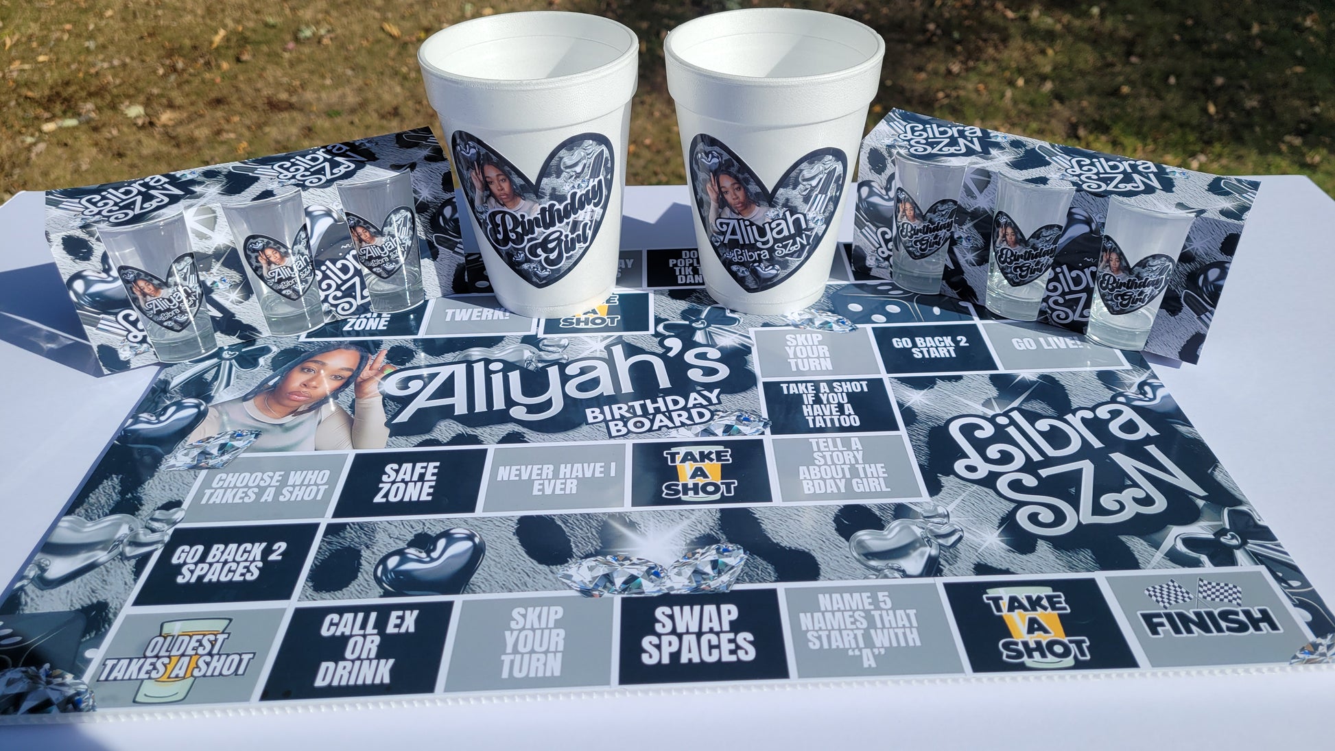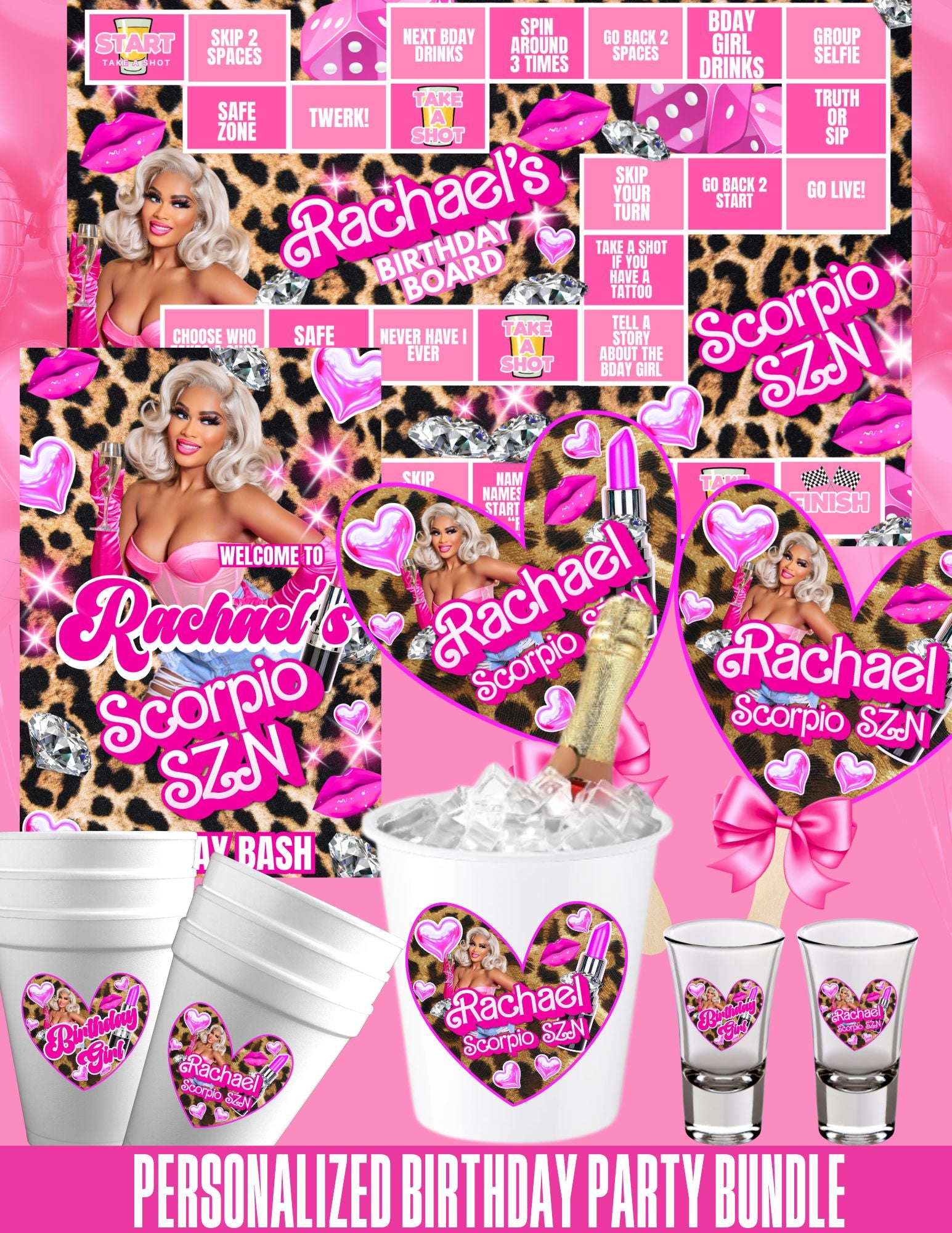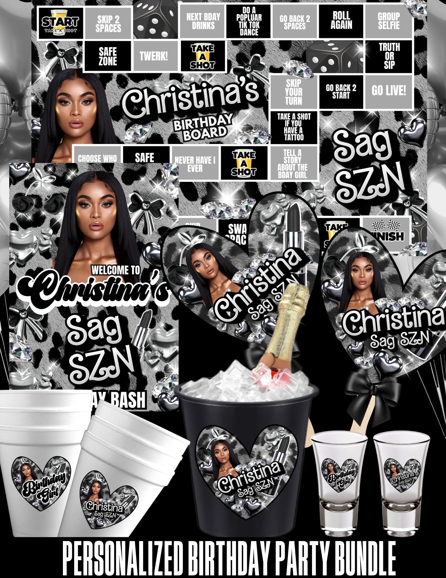 ADULT BIRTHDAY BUNDLE - Comes with (1) 11x17 Game Board, (12) plastic shot glasses, (12) 20oz. Styrofoam Cups, (12) game pieces, 12 Fans, (1) 13x19 Welcome Sign Poster, (1) Matching Ice Bucket and (2) dice. Please make sure the photos are clear for printing and that there are no missing body parts to the image. You can send your photo to eventsbyranyae09@gmail.com.