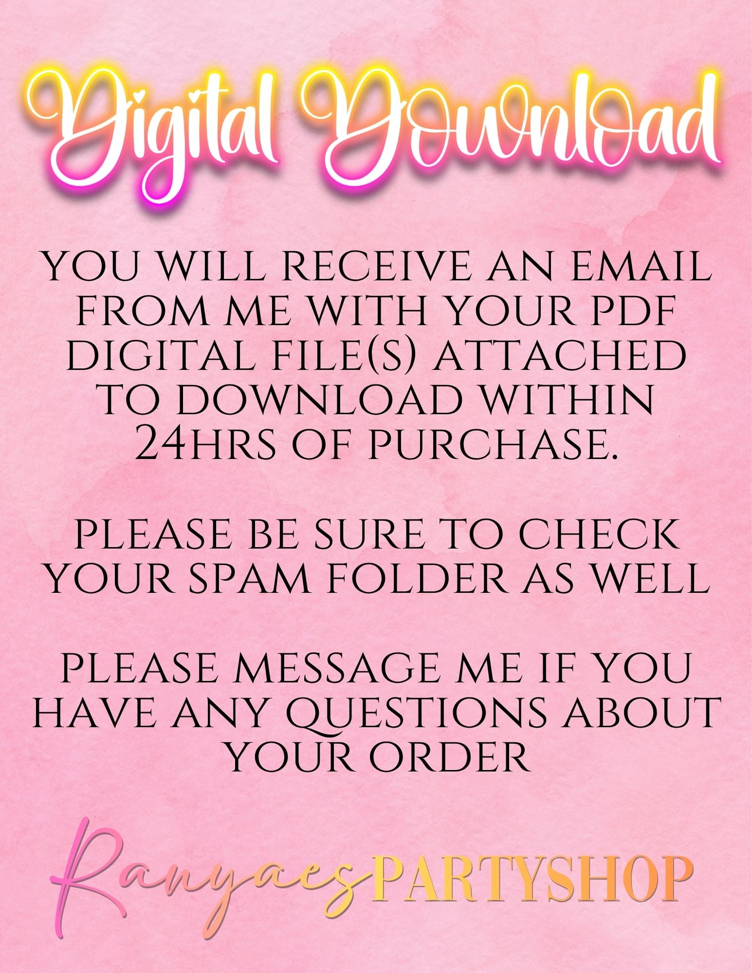 You will receive an email within 24hrs after purchase to the email address you have on file. This email will have the PDF files for you to download and print. Please Leave Invitation Information and Name and Age in the Personalization Area.