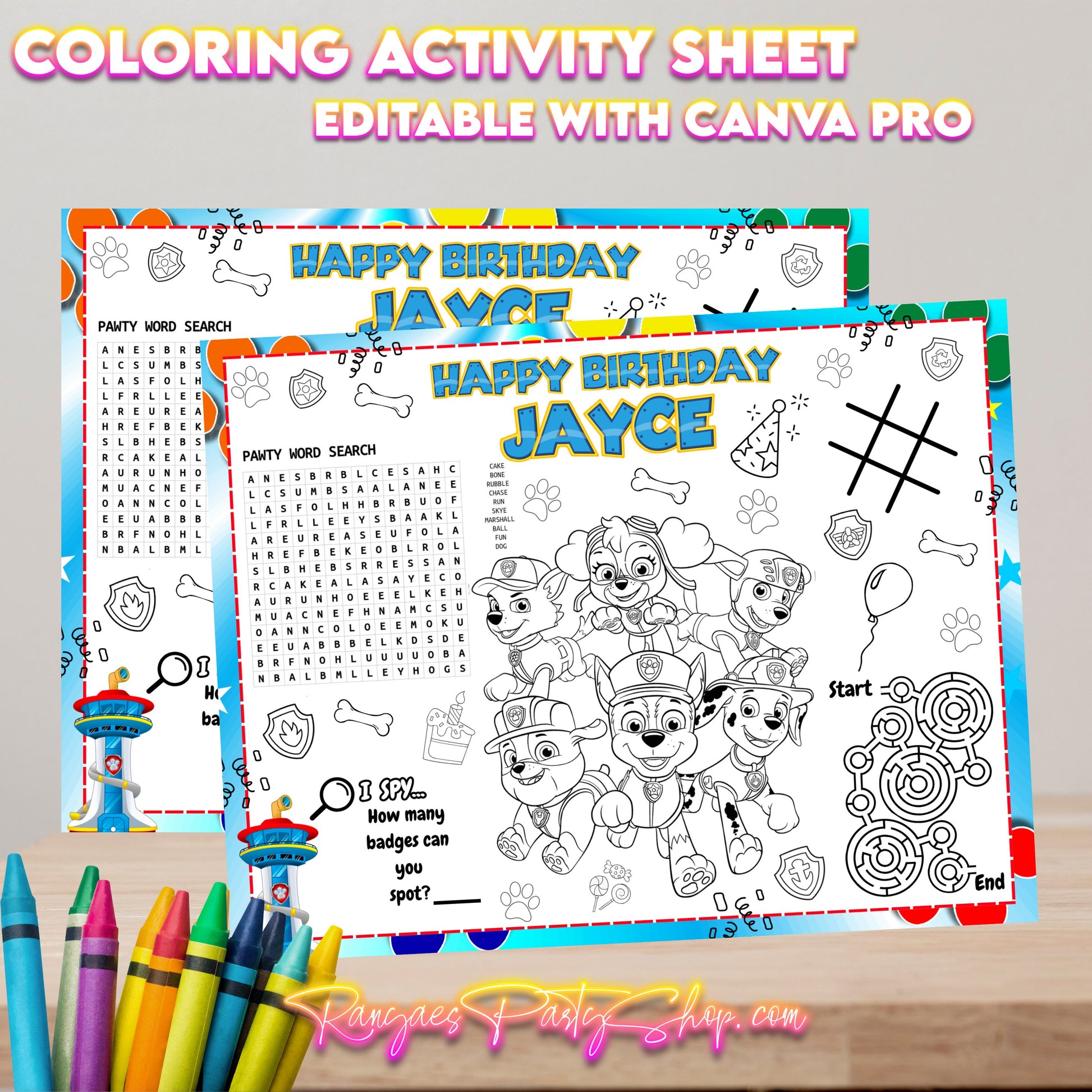 Paw Patrol Activity Coloring Sheet | Edit with CANVA PRO | Paw Patrol Party | Kids Coloring Activity Sheet